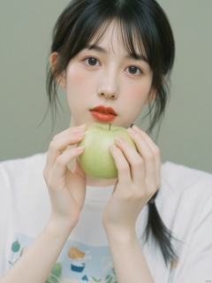 a close-up shot captures a young Asian woman holding a green apple in her hands. The woman's eyes are a piercing blue, and her hair is styled in a sleek bob. She is wearing a white t-shirt with a blue design on the front, adding a pop of color to the scene. Her lips are painted a vibrant red, and she's lips are pursed in a soft, velvety texture. The apple she is holding is a verdant green, with a few white spots on it. The backdrop is blurred, creating a peaceful and natural setting.