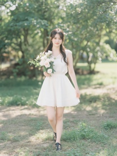 Captured at eye-level on a sunny day, a young Asian woman, dressed in a white dress and black shoes, is holding a bouquet of white roses in her right hand. She is standing on a patch of grass, with her left leg bent at the knee. The woman's hair is long and cascades in a ponytail, and she is smiling. The background is blurred, suggesting a forest of trees. The sun is shining, creating a soft glow on the scene.