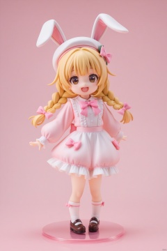 masterpiece, best quality, 8k, cinematic light, ultra high res, chibi, 1girl, child, hat, pink bow, bow, smile, open mouth, blonde hair, long hair, braid, solo, long sleeves, stuffed bunny, stuffed toy, white headwear, skirt, stuffed animal, twin braids, rabbit, animal ears, socks, bangs, full body, standing, brown eyes, pink bowtie, puffy long sleeves, hair bow, rabbit ears, beret, puffy sleeves,