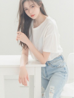 a young Asian woman with long dark brown hair, wearing a white short-sleeved t-shirt and jeans, is leaning on a white table. Her left hand is resting on the table, adding a touch of touch to the scene. The backdrop is a stark white wall, creating a stark contrast to the woman's white shirt.