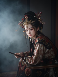 Photograph, Chinese ancient style, woman in elaborate Qing dynasty attire, elaborate headdress with red and gold accents, ornate robe with intricate patterns, holding a calligraphy brush, surrounded by misty background, soft lighting, serene expression, cultural heritage, historical ambiance.