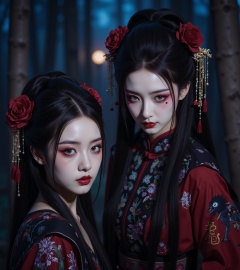 Inspired by Chinese mythology, two women in traditional Chinese attire, elaborate floral hair ornaments, elaborate makeup, elaborate red and black hanfu with intricate embroidery, standing in a dimly lit forest, surrounded by tall trees, eerie and mysterious atmosphere, soft blue and purple lighting, ethereal and haunting mood.