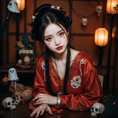 This is a high-resolution photograph featuring a young East Asian woman in traditional Chinese attire,Qing dynasty-inspired outfit. Her complexion is fair,with delicate,smooth skin and a slight blush on her cheeks. Her eyes are almond-shaped and accentuated with dramatic,dark eyeliner and mascara,while her lips are painted a vivid red,matching her outfit.,Surrounding elements such as skulls, ghosts. add a lively atmosphere. The pumpkin lanterns and other decorations in the background create a warm and mysterious atmosphere, echoing the clothing and adding fun. The portrayal of female characters is vivid, with costumes and movements full of festive joy and anticipation. The picture is full of vitality, surrounded by many dreamy lights and warm and cold tones, making people yearn for Halloween.