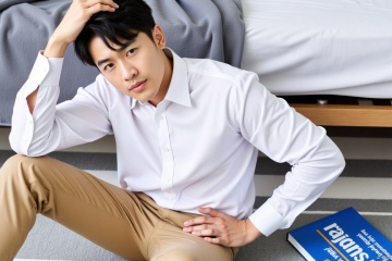 a young Asian man is seated on a gray striped carpeted floor. He is wearing a white button-down long-sleeved shirt and khaki pants. His left hand is resting on his head, while his right hand rests on his hip. His right hand is rested on a blue book with white text on it. A gray blanket is draped over the edge of the bed, adding a touch of warmth to the scene.