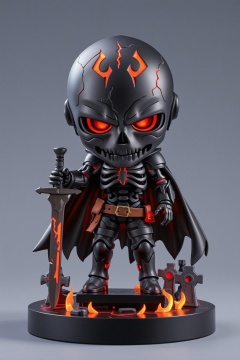 3D. chibi, A high-quality anime-style figure of a skeletal knight, dressed in dark, tattered armor with glowing red eyes. His body is made of detailed skeletal parts, with glowing cracks running through the bones, giving him a haunting look. He holds a rusted sword in one hand, and his tattered cape flows behind him. The figure stands on a minimalistic base adorned with glowing embers and small gravestones, capturing the eerie presence of a fallen knight risen from the dead.