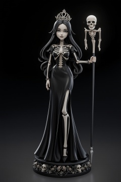 An anime-style figure of a skeletal princess, wearing a flowing black gown with lace details and a skeletal tiara. Her bones are intricately sculpted, with a soft glowing effect around her ribcage and eyes. She holds a glowing staff topped with a skull in one hand, and her pose is both elegant and sinister. The base features a gothic design with roses and skulls, creating a dark, regal atmosphere.
