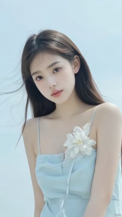 a medium-sized Asian woman with long brown hair,wearing a light blue sleeveless dress adorned with a white flower on the left side of her dress.The backdrop is a soft blue sky,creating a stark contrast to the woman's outfit.,