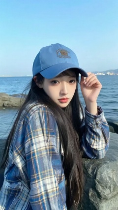 Close to a young Asian woman,is seated on a large black rock. She is adorned with a blue and white plaid shirt. The woman's hair is long,dark brown,and she's wearing a blue baseball cap. The backdrop of the image is a body of water,with a clear blue sky above.,