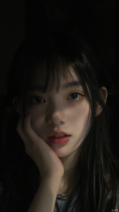 dark,caustics,colorful,gorgeous light and shadow,fullbody,The girl's pale skin,her lips are slightly open to reveal her teeth,and her blue eyes are blurry and dreamy.mott led light and shadow,portrait,black_hair,