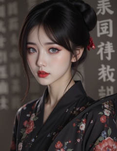1girl, with a black kimono adorned with flowers. Her hair is pulled back in a bun cascading down her shoulders framing her face. She is adorned with a bold red lip adding a pop of color to her outfit. Her eyes are a piercing blue her eyebrows are a darker shade of brown and her lips are a lighter shade of red. She's holding a black hand fan with a floral pattern on it adding depth to the scene. The background is blurred The background is a wall with Chinese characters written on it creating a stark contrast to the woman's outfit.sexy