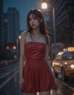 Under the dusk of Hong Kong street corner, drizzle, standing under the street lamp wearing a red strapless skirt evening dress beauty, rain wet her long hair, she affectionately looked at the pedestrian passing on the street overpass, infinite melancholy, roadside driving taxi, the light illuminated her slender legs under the skirt, full of seducing tension.