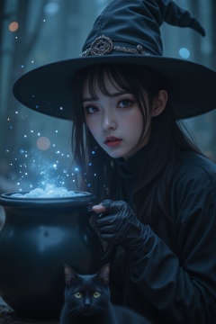 A robot witch, like an Asian girl, wearing a black witch hat, full body, a black cat at her feet, with Halloween style face makeup, holding a black cauldron coffee cup filled with bubbling liquid, the liquid is shining with little blue light, under the starry sky at night, HD style, grotesque beauty, sharp focus, 8K cyberpunk, blackcore, mysterious robot god