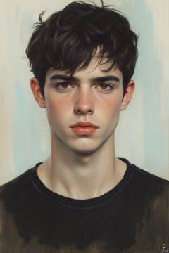 This image is a highly detailed, realistic digital painting of a young man. The painting employs a hyperrealistic style, characterized by its meticulous attention to texture and shading. The subject has a fair, slightly tanned complexion with a symmetrical face. His dark, wavy hair is slightly tousled, framing his face and falling slightly over his forehead. His expression is neutral, with a slight hint of seriousness, and his eyes are a deep, penetrating brown. He has a strong, chiseled jawline and a prominent nose, contributing to a somewhat masculine appearance.