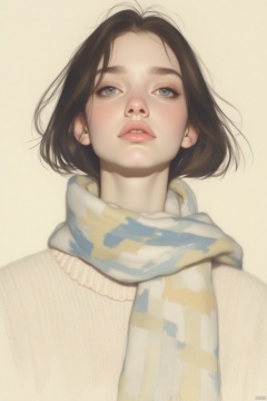 She is dressed in a light-colored, textured sweater that appears to be knitted, with subtle patterns and a soft, cozy feel. Around her neck, she wears a scarf with a geometric pattern in shades of blue, white, and yellow, adding a touch of warmth and texture to the image. The background is a plain, light beige, which helps to focus attention on the subject.