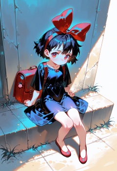 artist:Tsukumizu,(artist:porforever:0.5),(artist:rei \(sanbonzakura\):0.8),kiki_\(majo_no_takkyuubin\), 1girl, solo, looking_at_viewer, bangs, white_background, dress, bow, sitting, closed_mouth, full_body, short_sleeves, hair_bow, hairband, shoes, bag, black_dress, red_bow, arm_support, red_footwear, between_legs, no_socks, flats best quality, amazing quality, very aesthetic, absurdres
