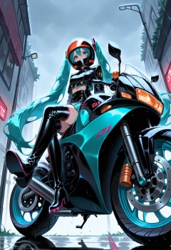 1girl, solo, hatsune miku, boots, long hair, motorcycle, motor vehicle, thigh boots, rain, sitting, crossed legs, very long hair, twintails, looking at viewer, black footwear, gloves, from below, helmet, thighhighs, skirt very aesthetic, masterpiece, absurdres