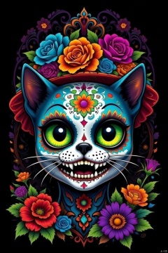 solo, looking at viewer, green eyes, flower, teeth, no humans, rose, animal, cat, black background, red flower, blue flower, yellow flower, purple flower, colorful, orange flower