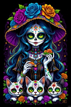 1girl, solo, long hair, looking at viewer, smile, hat, dress, holding, jewelry, green eyes, blue hair, upper body, flower, short sleeves, multicolored hair, teeth, artist name, necklace, black dress, makeup, witch hat, rose, colored skin, watermark, cat, black background, colored sclera, blue flower, skull, yellow flower, purple flower, hat flower, blue rose, skeleton, yellow sclera, purple rose, orange flower, green flower