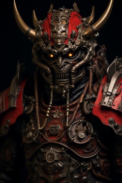 samurai, solo, armor, black background, tube, helmet, cable, mask, looking at viewer, horns, kabuto (helmet), japanese armor, 1boy, upper body, glowing, robot, glowing eyes, male focus, science fiction, shoulder armor