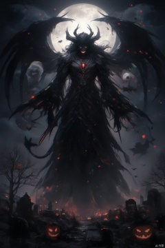 solo, long hair, black hair, 1boy, weapon, male focus, sword,evil person,Halloween Street,sky, tree, no humans, night, moon, star \(sky\), night sky, scenery, full moon, halloween, starry sky, ghost, jack-o'-lantern, pumpkin, bat \(animal\), bare tree, tombstone, graveyard