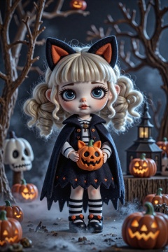 Q-version wool felt,A whimsical Halloween scene featuring,Q-version wool felt,A whimsical Halloween scene featuring a doll with cat ears, holding an orange and black pumpkin.