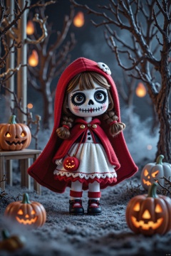Q-version wool felt,A whimsical Halloween scene featuring a small, adorable skeleton girl in her red cape and dress with white trim