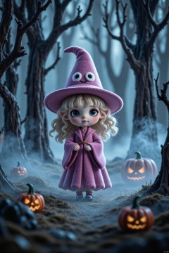 Q-version wool felt, A whimsical Halloween scene featuring a small, a unique style stands in an ancient forest on a foggy morning. Blonde and blue-eyed witch with front, dressed in a traditional pink robe and wearing a pink wizard's hat, surrounded by a dense forest shrouded in thick fog. The light is soft and diffused, casting soft shadows that create a serene and mysterious atmosphere. The artistic influence is surrealism, which adds a dreamlike fantasy element to the composition. Award-winning work, epic composition, extremely detailed