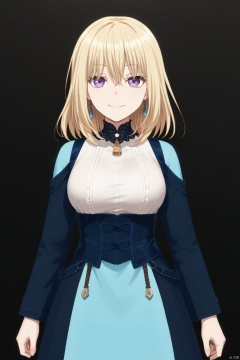 uika,uika, 1girl, blonde hair, bangs,purple eyes, smile, medium hair,hair between eyes