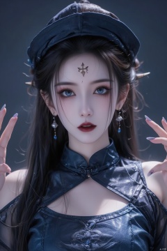 1girl, solo, long hair, looking at viewer, blue eyes, black hair, hat, bare shoulders, jewelry, upper body, earrings, detached sleeves, pointy ears, fang, lips, fingernails, clothing cutout, makeup, facial mark, chinese clothes, piercing, ear piercing, ofuda, red lips, jiangshi, qing guanmao
