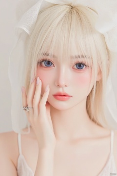 HD photography,Ultra-clear facial details, This is a digital painting of a young woman with a fair, porcelain skin tone and long, straight blonde hair. She has large, expressive blue eyes with thick, dark eyelashes and subtle winged eyeliner. Her eyebrows are delicately arched, and she has a small, delicate nose and full, pink lips. She is wearing a white lace headband with a large, white bow on the side, which adds a whimsical, vintage aesthetic to her look. Her outfit consists of a white, sleeveless top that is slightly transparent, revealing a hint of her skin. She is holding her face with her left hand, which has a simple silver ring on her ring finger. The background is a soft, neutral beige color, ensuring that the focus remains on her face and head. The painting has a soft, dreamy quality, with a blend of pastel colors, particularly blues and pinks, adding a gentle, ethereal feel. There are subtle, soft-focus effects that create a slightly blurred background, drawing attention to her delicate features. The overall style is reminiscent of anime or fantasy art, with a focus on detailed, expressive facial features and a soft, dreamy atmosphere.