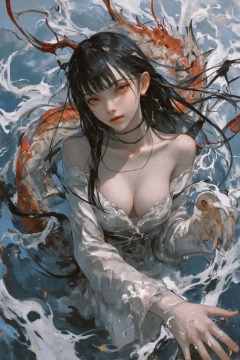 Masterpiece, Top quality, Best Quality, Official art, beauty aesthetics, 1 girl, a dragon behind Me, Single, Hanfu, Long hair, bangs, mid-chest, Grotesque, Colorful, sea, Dynamic Angle, cleavage, water, swirls, Drops, wet clothes, beautiful details Water, Dynamic Angle, Liquid background, Splash, Panorama, Dynamic poses, Fish, Patterns,