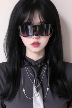 1girl, solo, long hair, black hair, jewelry, necktie, necklace, lips, sunglasses, realistic