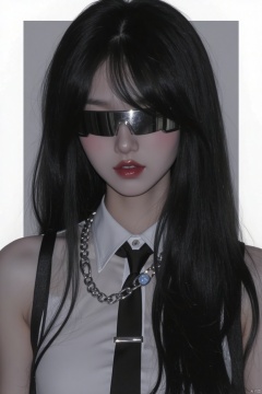 1girl, solo, long hair, black hair, jewelry, necktie, necklace, lips, sunglasses, realistic