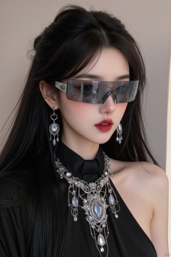 A young woman with long, raven-black hair cascading down her back, adorned with a statement necklace and delicate necklace. She sports a stylish necktie and matching earrings, her luscious lips painted a bold shade of red. Framed by a pair of sleek, dark-tinted sunglasses perched on the bridge of her nose, she exudes confidence and poise, set against a neutral background that lets her striking features take center stage.