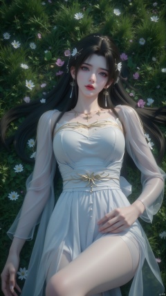 Aerial view, taken from above, a peaceful 8K photo of a girl (GG) lying on a lush grassland, her long black hair cascading down her back like a waterfall. A delicate hair ornament embellished her hair, and an elegant white apron embraced her slender figure. Her waist and waist were surrounded by petals and branches, makeup, eye shadow, red lips, and a small butterfly perched on the edge of the earrings. Added a whimsical atmosphere. Wildflowers, butterflies, petals, 1lxq high-definition