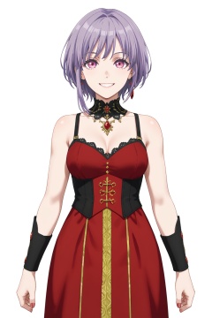 (masterpiece:1.3),(the best quality:1.2),(super fine illustrations:1.2),(Masterpiece),high quality,high detail,(white background:1.2),looking at viewer,(SOLO:1.4),outline,simple background,upper body, cowboy shot,looking at viewer,(((arms at side))),  amoris, solo, smile, short hair, purple eyes, red eyes, bangs<lora:大喵-anime:0.7>