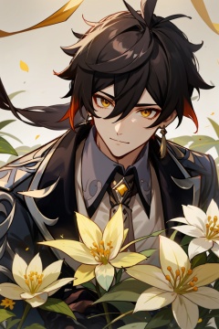 <lora:output_zhongli:0.6>,zhongli (genshin impact),1boy,male focus,(*****),gloves,brown hair,solo,bangs,long hair,black gloves,jewelry,single earring,hair between eyes,earrings,multicolored hair,flower,long sleeves,gradient hair,(ponytail),tassel,closed mouth,jacket,tassel earrings,black hair,necktie,formal,yellow eyes,suit,yellow flower,white necktie,smile,collared shirt,close-up,