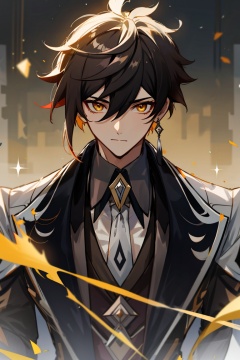 <lora:output_zhongli:0.6>,1boy,male focus,zhongli (genshin impact),solo,gloves,long hair,brown hair,black gloves,jewelry,single earring,hair between eyes,earrings,bangs,long sleeves,tassel,jacket,ponytail,yellow eyes,multicolored hair,necktie,tassel earrings,collared shirt,blurry,looking at viewer,gradient hair,formal,black hair,shirt,suit,