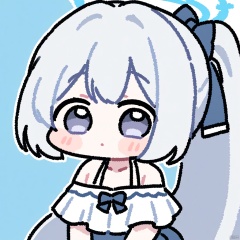,chibi,,1girl,miyako \(swimsuit\) \(blue archive\),blue archive,long hair,ponytail,white hair,bangs,bow,halo,hair bow,purple eyes,breasts,very long hair,grey hair