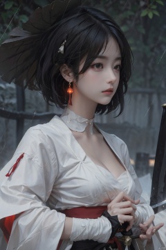 1girl, solo, breasts, short hair, black hair, red eyes, gloves, long sleeves, hat, holding, cleavage, jewelry, medium breasts, closed mouth, upper body, weapon, earrings, outdoors, japanese clothes, choker, black gloves, puffy sleeves, sword, wide sleeves, holding weapon, lips, sash, blood, profile, makeup, glowing, looking away, bandages, holding sword, knife, tassel, rain, bandaged arm, nose, brown headwear, holding knife, reverse grip