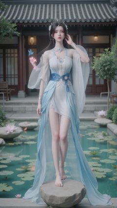 1 girl, solo, a girl standing on a stone in the yard, gradient perspective, gradient posture, light makeup, black hair, hair accessories, necklace, jewelry, earrings, white and blue mixed dress, silk material clothing, long sleeves, wide sleeves, blue belt, belt embellished with decorations, pale face, blue eyes, exposed legs, bare feet, perfect body proportion, slim, left hand touching the head, right hand on the waist,