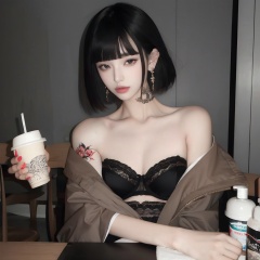 1girl, solo, looking at viewer, short hair, bangs, black hair, jewelry, sitting, jacket, upper body, earrings, blunt bangs, cup, lips, Bra, small amount of dress lace, grey eyes, strapless, tattoo, chair, table, bandeau, tube top, arm tattoo, A girl with a tattoo on her right should,clean background, Light master
