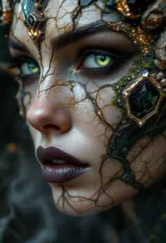 the image must contain maximum high quality details, the realism of the image must be maximal and of high quality,A close-up of a goddess’s face, darkly divine and intricately composed, where each feature blends seamlessly into a harmonious yet chaotic arrangement of materials. Her skin appears as a rich tapestry of cracked, aged marble, with intricate veins of green moss weaving through the fissures, giving a sense of ancient wisdom. Delicate, shimmering shards of obsidian and onyx form her cheekbones, catching light and reflecting it with a mysterious glow. Her forehead is adorned with luminescent crystals that pulse softly, radiating an otherworldly energy.Her lips, carved from weathered, twisted wood, are textured and gnarled, hinting at age and strength, while droplets of dark, corrupted water collect at the corners of her mouth, glistening like gemstones. The contours of her face are outlined with smooth, polished stones, which merge with soft, ethereal wisps of smoke and mist that drift around her features, adding an air of mystique.Her eyes, made of shattered ice, glow with an intense, icy blue light, exuding a fierce, demonic presence. Sprigs of silver fern and delicate vines entwine through her hair, adding natural beauty to the chaos. The entire composition feels like a living, breathing entity, where each element—moss, stone, crystal, and wood harmonizes in a mesmerizing yet unsettling display of ancient power and nature's wildness.