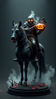 C4D, 3D, Halloween-Themed Chess Set, Knight: Headless Horseman or Werewolf Appearance: A headless knight carrying a glowing jack-o'-lantern under his arm, with eerie mist swirling around, or a ferocious werewolf mid-transformation, with razor-sharp claws and teeth. Mount: A spectral horse with ethereal, glowing eyes, or a dark, twisted wolf with fur as black as coal. Armor: Rusty, ancient armor overgrown with vines and moss, or fur-covered, torn armor with a hint of innocence. Weapon: A massive, battle-worn axe, a sword with an otherworldly glow, or clawed hands with razor-sharp nails. Theme: The embodiment of speed, ferocity, and terror, with an aura of foreboding and dread. Base: A round base resembling a misty, moonlit forest floor, with scattered crimson leaves or ancient, weathered rocks.