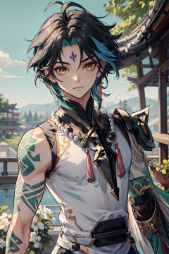 <lora:xiao:0.8>,xiao (genshin impact),1boy,solo,male focus,arm tattoo,(tassel),yellow eyes,diamond purple solid mark,forehead mark,multicolored hair,black hair,green hair,closed mouth,ahoge,green gloves,bangs,asymmetrical clothes,outdoors,looking at viewer,white flower,tree,upper_body,(bead_necklace:0.7),