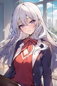 (masterpiece),(best quality),1girl, long_hair,(medium_breasts:1.2),solo, white hair,neckbow,jacket,school uniform,black thighhighs,