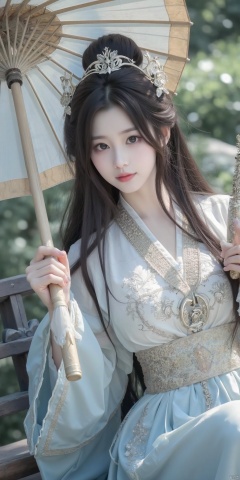 A woman, wearing a hanfu, long hair, delicate face, delicate hands, holding an umbrella in her left hand, holding a sword in her right hand, half-length shot,Lying, rich details