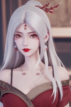 1girl, solo, long hair, hair ornament, dress, bare shoulders, jewelry, upper body, white hair, earrings, blurry, blurry background, facial mark, forehead mark, red lips