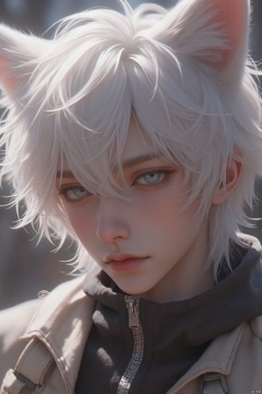 1 boy,cat ear,white hair, upper body, close-up, jacket, short hair, outdoor, backpack.(White hair) Masterpiece: 1.2), best quality, high resolution, uniform 8k wallpaper, (Illustration: 1), perfect lighting, very detailed CG, fine Detail, Very detailed, soft lighting and Shadows, soft and striking lighting, Film Texture: 1.2, (Skin pores: 1.2), (Detailed Skin texture: 1), (Solo: 1.5)), detailed face, (Perspective: 1.1), hazy, low-key: 1.1, Depth of field, (8k, RAW photo, best quality, Masterpiece: 1.2), (Realistic, realistic: 1.4), (Very detailed CG unified 8k wallpaper), (Detailed face: 1.4), (Beautiful detailed eyes: 1.2)