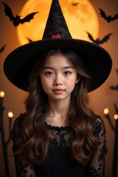 Cute Halloween witch portrait, young Asian girl, Front view. Background: warm golden lighting, full moon, flying bats silhouettes, Halloween decorations. Studio photography style, soft dramatic lighting, high quality, detailed,Outfit_cute